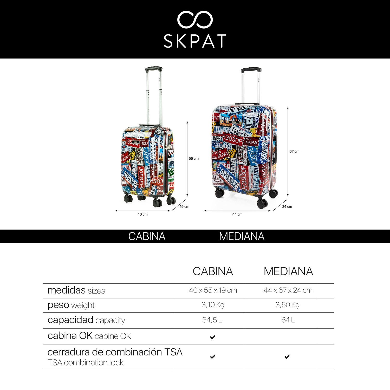 SKPAT Kleinkabinenkoffer Größe 50 aus Polycarbonat, einem leichten und starken Material.