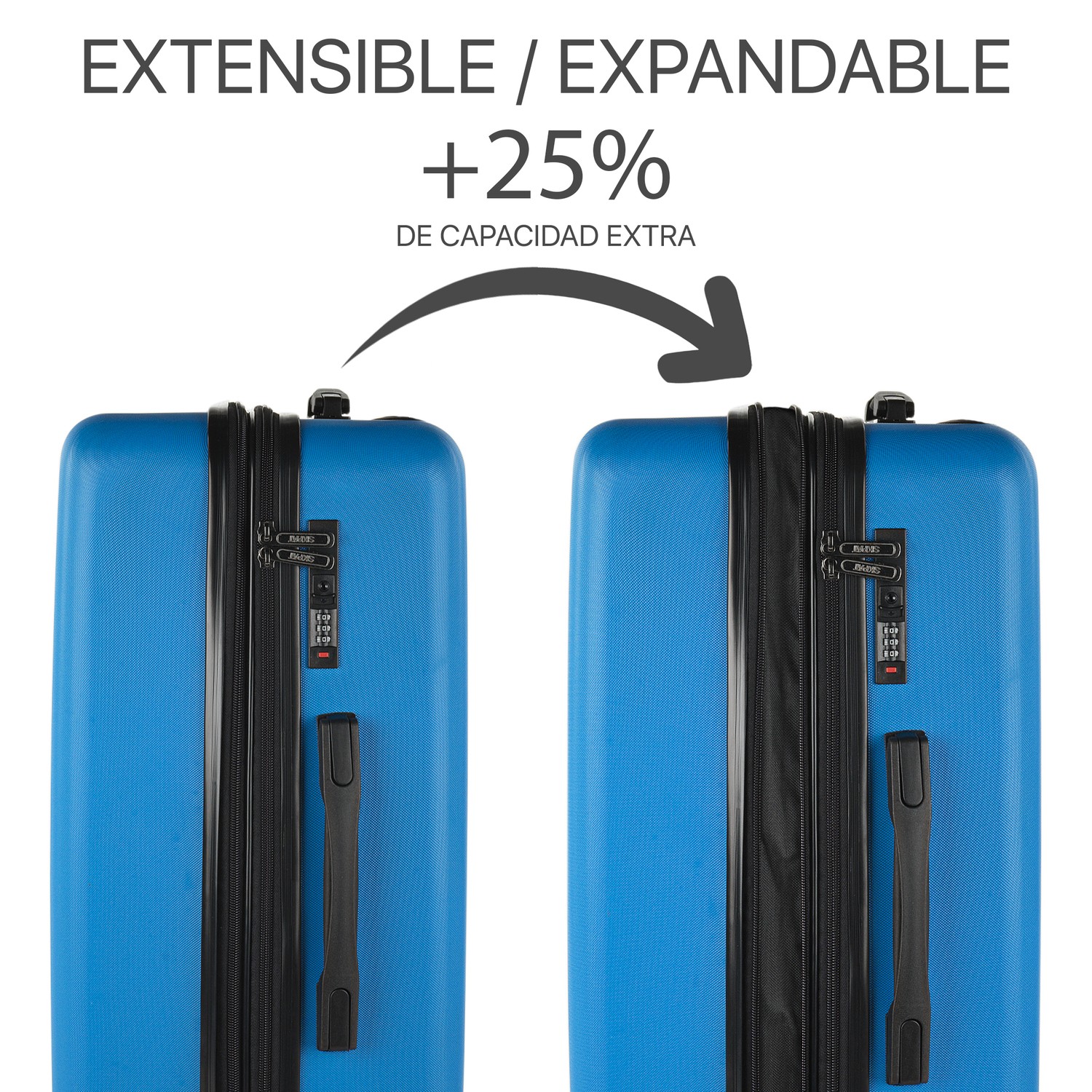 Alle Koffer sind bis zu 35% zusätzlicher Kapazität erweiterbar. Darüber hinaus verfügen sie über einen integrierten Verschluss mit TSA-Kombination. 4 Doppelräder, die sich um 360 Grad drehen. Verstärkter Teleskopgriff. Innen-Organizer.