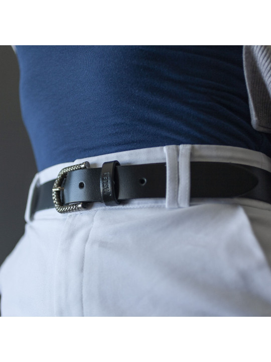 Metallic buckle and engraved logo.