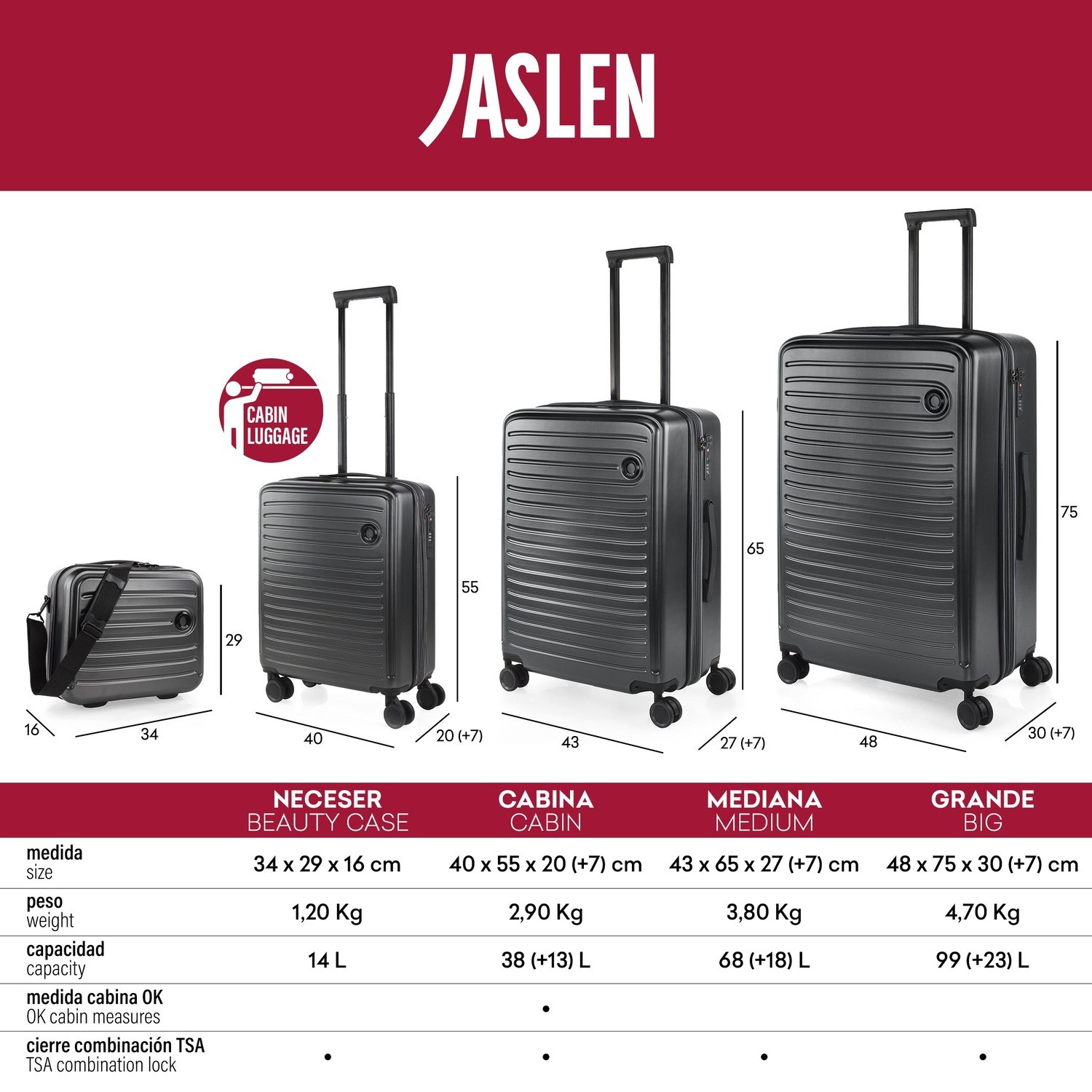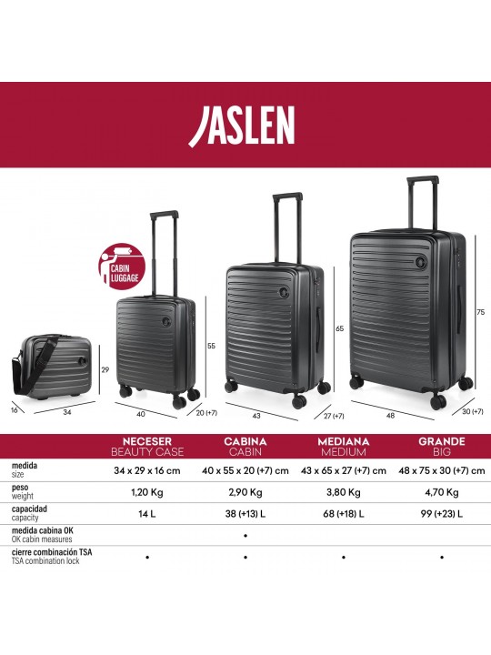 The JASLEN brand presents its PADUA collection, an exclusive line of high quality travel cases. With an elegant and modern design, these suitcases offer durability and resistance thanks to their ABS material. The PADUA collection features various sizes, including cabin, medium and large suitcases, to suit your travel needs. Equipped with high-performance wheels and telescopic handle, ITACA ROMA suitcases guarantee a comfortable and practical travel experience. Don t wait any longer and get your set!