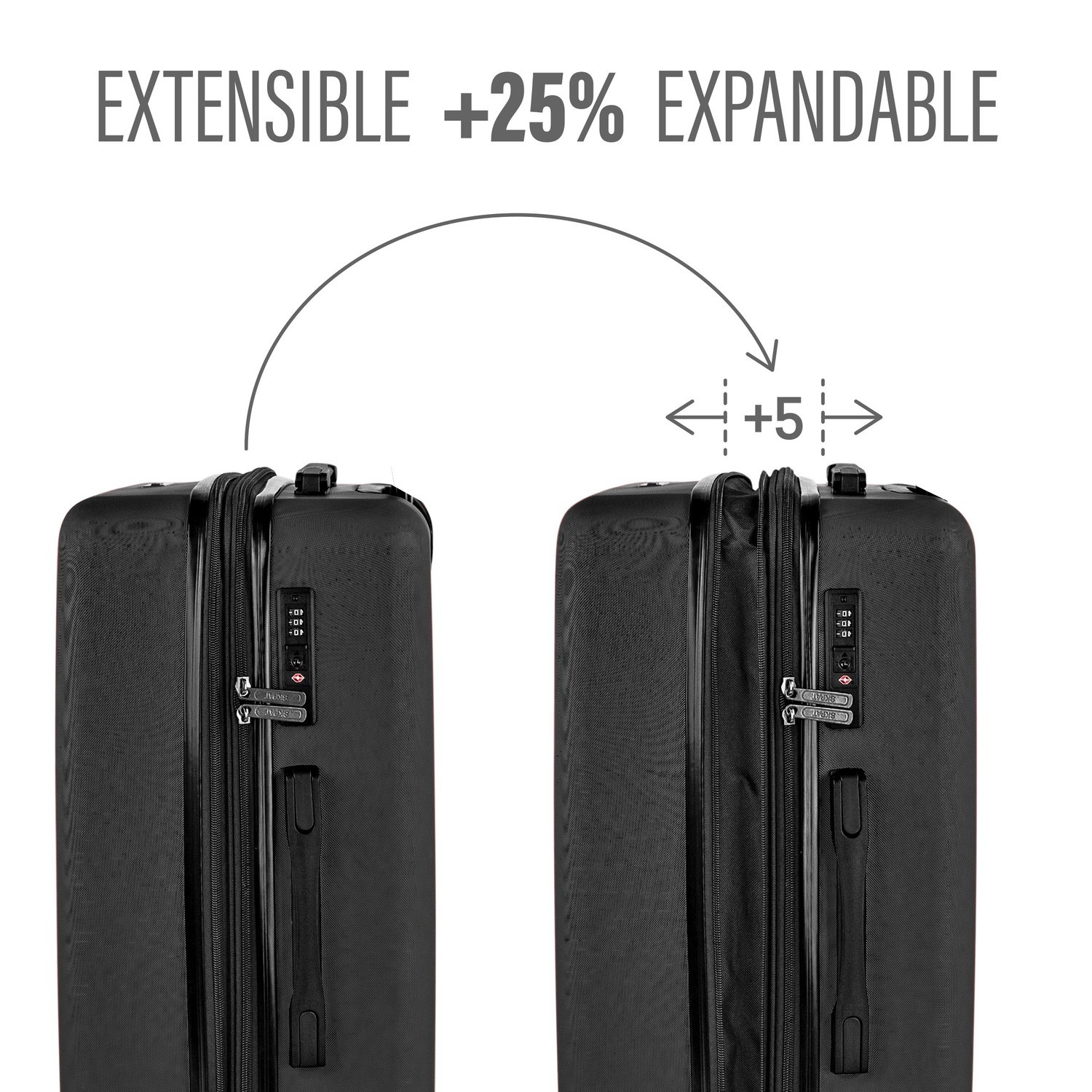 All suitcases are extendable up to 35% additional capacity. In addition, they have integrated closure with TSA combination. 4 double wheels rotating 360 degrees. Reinforced telescopic handle. Interior organizer.