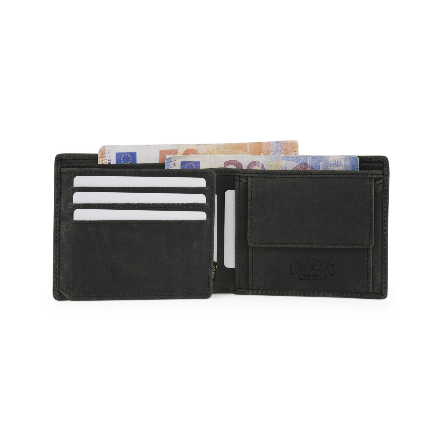 Múltiples compartimentos para tarjetas, billetes y monedas.