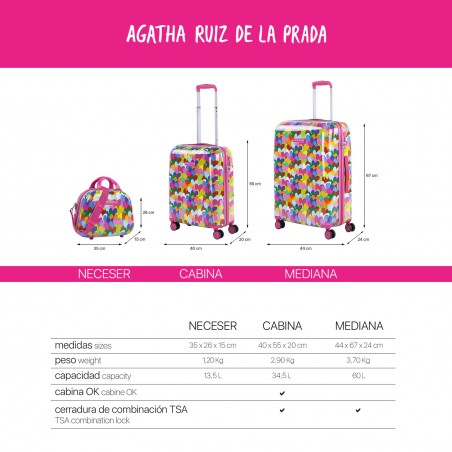 Maleta de viaje infantil 67 cm mediana / grande de policarbonato estampado de AGATHA RUIZ DE LA PRADA. Desde siempre, AGATHA RUIZ DE LA PRADA ha estado siempre en la actualidad de la moda plasmando en sus creaciones su personalidad. Todos los productos AGATHA RUIZ DE LA PRADA marcan tendencia con sus inconfundibles diseños. Esta maleta es ideal para viajes de una semana. Las maletas AGATHA RUIZ DE LA PRADA están pensadas para todas tus necesidades y un máximo confort en el viaje. Características principales Dimensiones Mediana / Grande Total: 67x44x24 cm. Cuerpo: 61x42x24 cm Volumen: 60 L Peso: 3,70 kg Exterior Material: Policarbonato Estampado. Cierre con candado de combinación integrado de 3 dígitos para mayor seguridad. Cremallera de doble cursor con orificios para candado. Deslizamiento muy suave. Asas retráctiles superior y