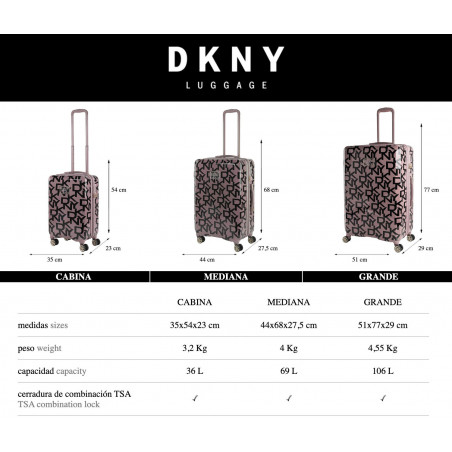 Set de maletas trolleys de la marca DKNY tamaños 50/60/70 realizadas con ABS/PC, un material ligero y a la vez resistente.