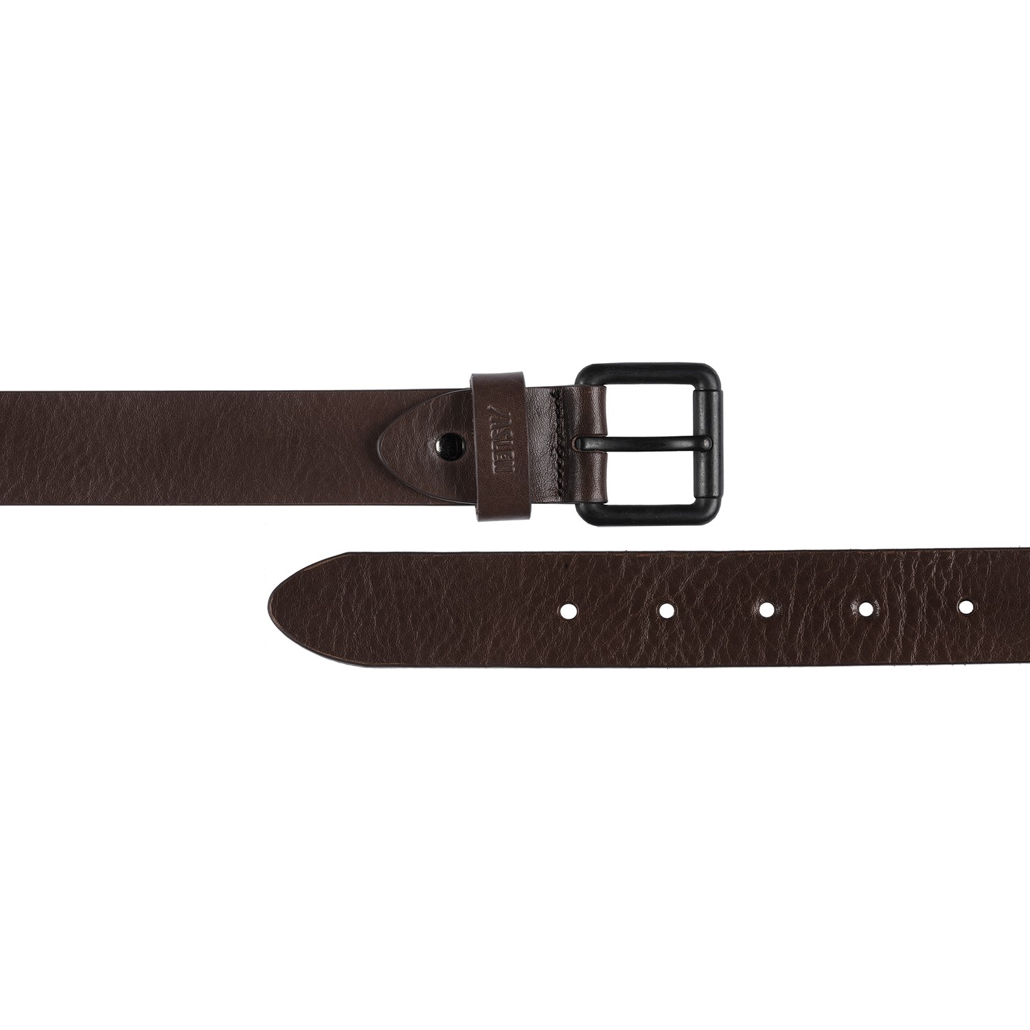 Boucle métallique et logo en relief gravé sur le cuir.