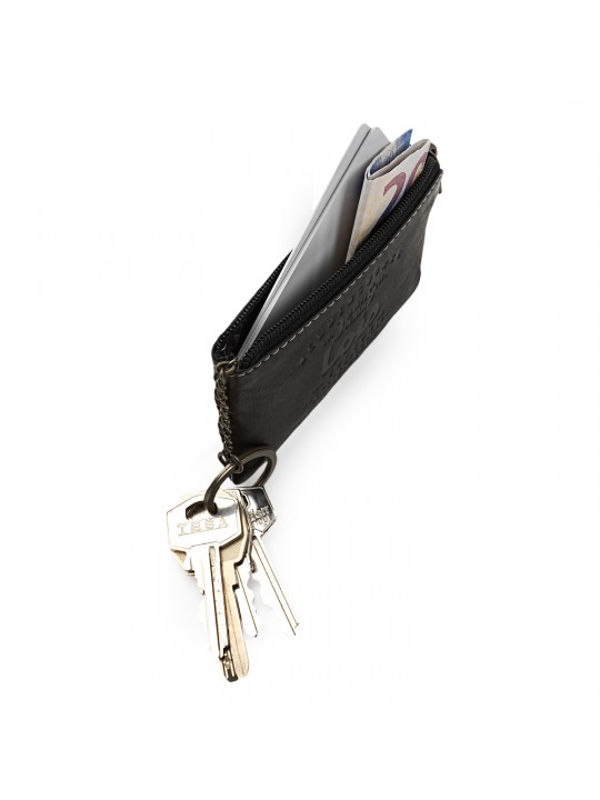Avec fermeture éclair et porte-clés interne avec anneau. Deux compartiments externes pour les cartes et les billets.