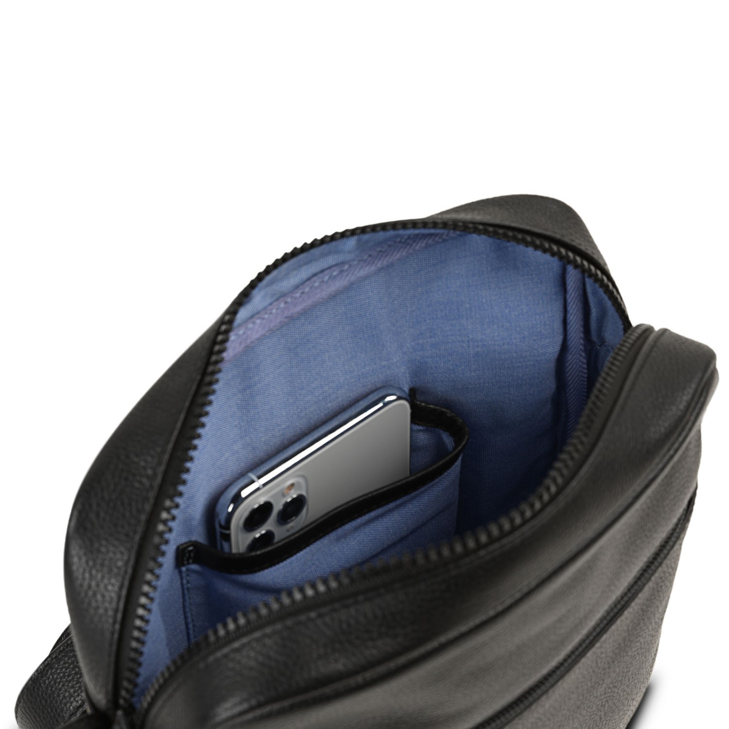 Questa collezione si distingue dalle altre per la texture della pelle, gli accessori metallici nero opaco, la zip iniettata e le spesse cuciture a contrasto.