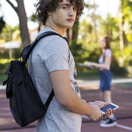 Zaino con cinghie regolabili da uomo. 2 maniglie e porta USB. Tasca frontale con cerniera. Tasche laterali e scomparto interno per laptop da 12". Tasca antifurto posteriore.