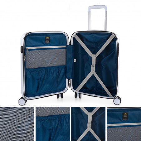 Fodera interna con cerniera e maglia, diversi compartimenti. Elastici regolabili. La piccola con maniglia retrattile superiore. chiusura con doppio cursore. La mediana ha 2 maniglie retrattili, superiore e laterale. Massimo comfort in qualsiasi posizione.