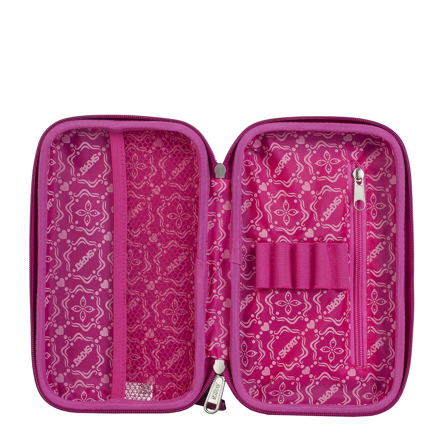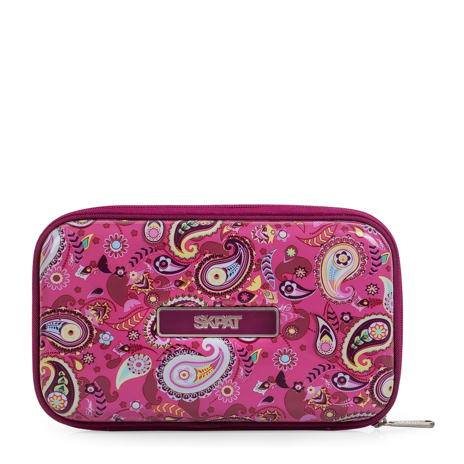 Titular rígido da marca SKPAT. O interior tem o forro personalizado da marca, juntamente com um bolso com zíper, lápis e porta-caneta e uma grade extra para armazenar os menores objetos. Medidas: 23 x 13 x 5,5 cm. Material: policarbonato.